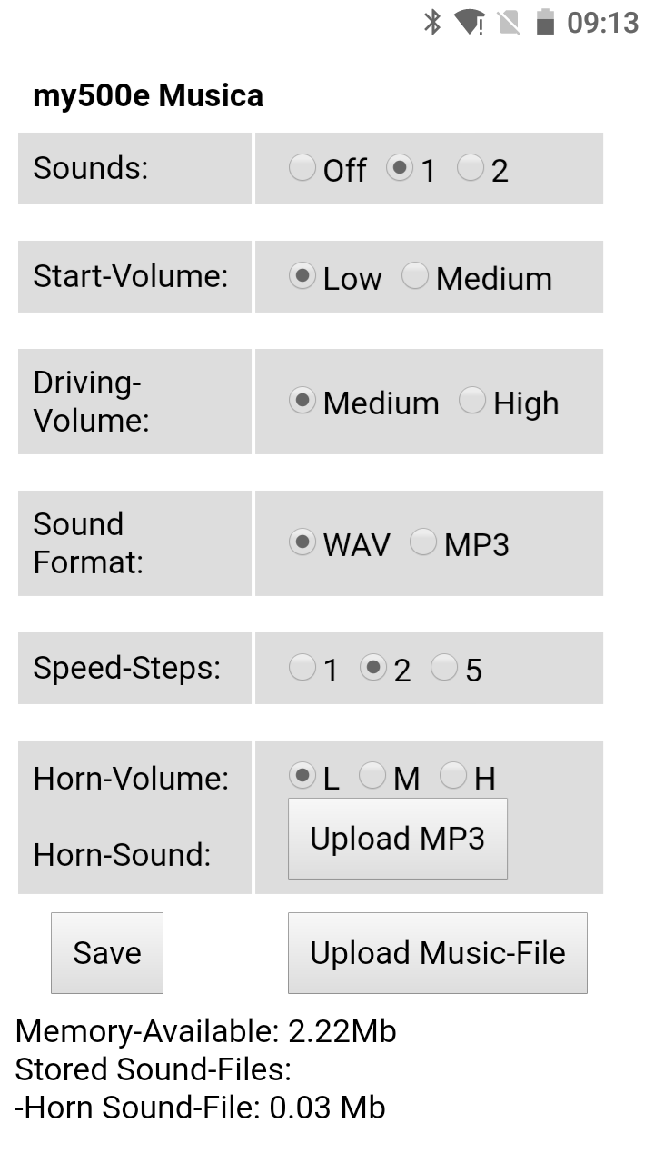 - Up to two sounds files: #1 for standstill, #2 while moving
